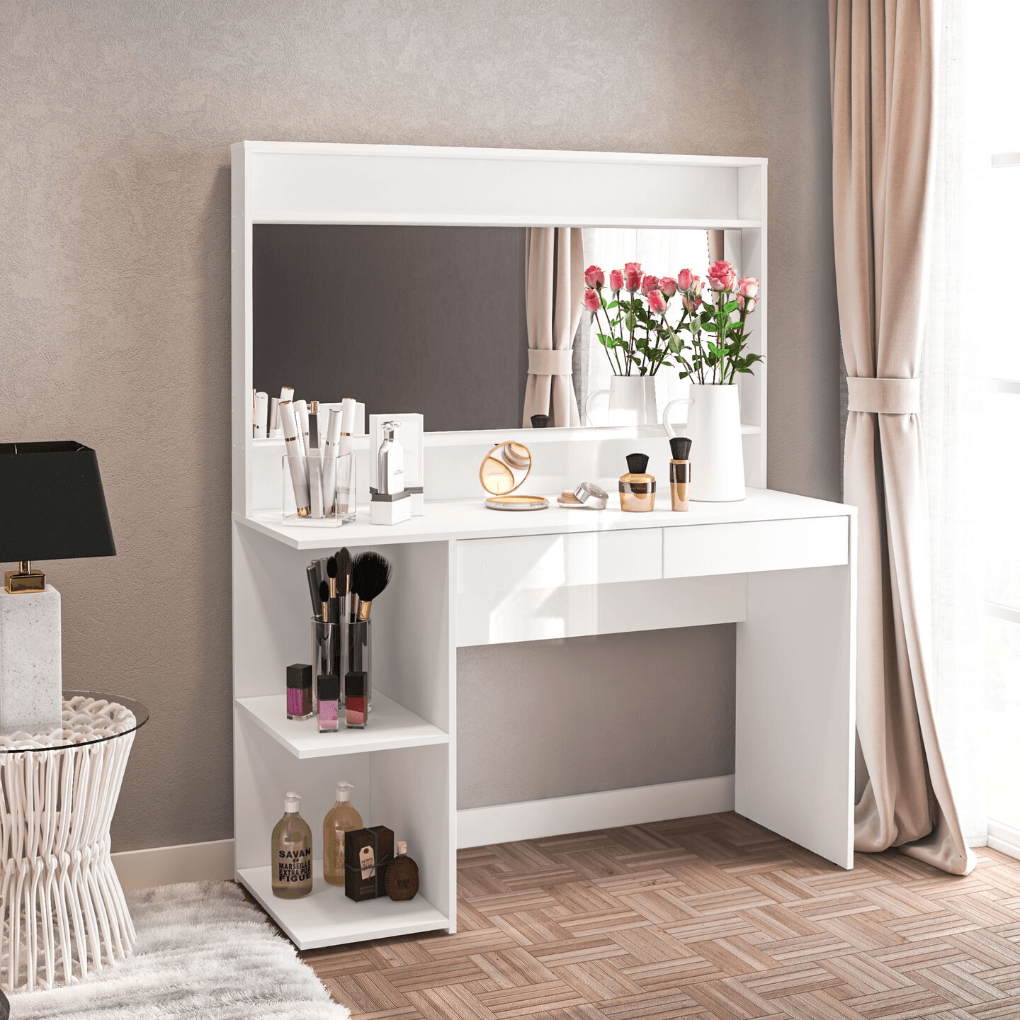 Constructed from high-quality MDF manufactured wood, this vanity dresser delivers exceptional stability and durability. The engineering ensures the piece remains level and steady even with mirrors and grooming activities. The manufacturing process creates consistent quality throughout, while the material properties provide excellent dimensional stability preventing warping or twisting over time.