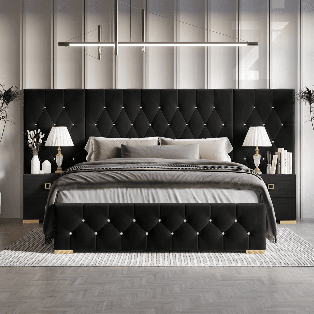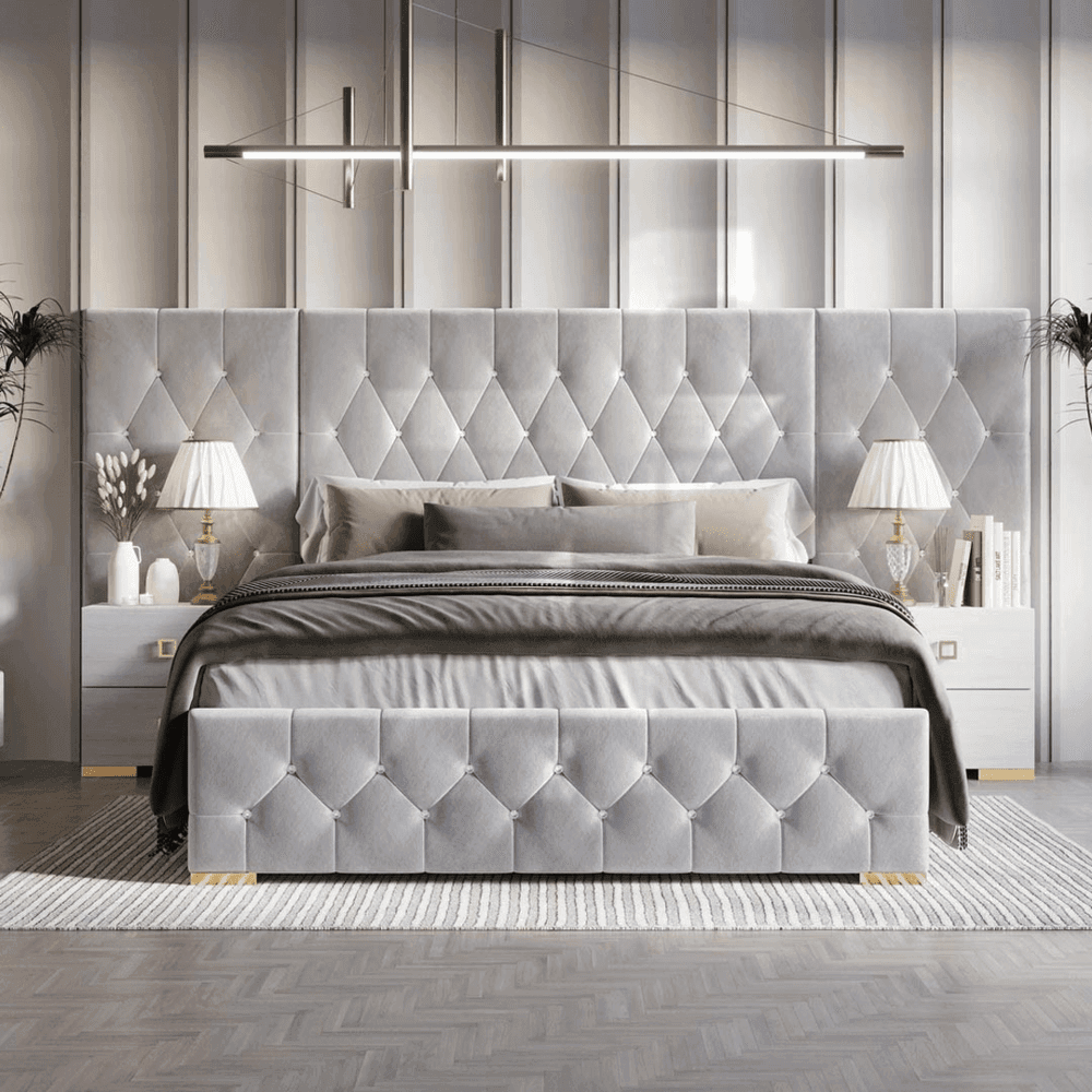 Lavish your bedroom with the luxurious and elegant CraftPorch Velvet Tufted Platform Bed with Wall Panels that represents the latest in home decor furniture innovation. This extraordinary bed features diamond button tufted accents on the headboard and footboard, creating a glamorous aesthetic that is perfect for upgrading your bedroom or guest room with Hollywood-inspired sophistication. The bed is upholstered in high quality velvet fabric and padded with comfortable foam, providing a lavish and opulent look at an affordable price that makes luxury accessible. The high wall panel reaching to your roof gives your home an upholstered look that transforms your entire bedroom into a cohesive, designer worthy space. At Zohaib Furniture, we’ve designed the CraftPorch Luxurious Bed to deliver spectacular visual impact through its dramatic wall panel, crystal diamond tufting, and impeccable craftsmanship.