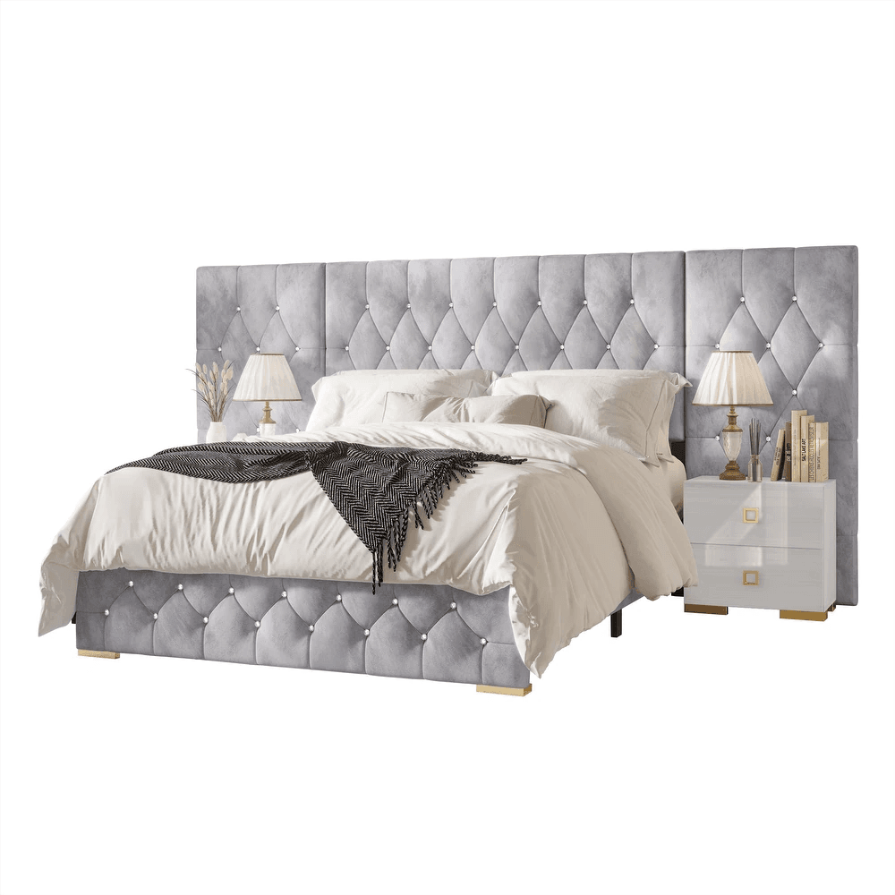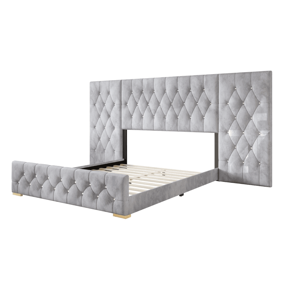 The diamond button tufted accents with crystal diamonds on the wall panel headboard and footboard create breathtaking glamour and sparkle. Diamond tufting creates geometric pattern where buttons or accents are positioned to form diamond shapes across the upholstered surface. The addition of crystal diamonds whether genuine crystal or high quality faceted acrylic elevates this traditional technique to spectacular luxury. These crystal accents catch and reflect light, creating shimmer and sparkle that adds Hollywood glamour, red carpet sophistication, and eye catching brilliance. The diamond tufting appears on both the headboard and footboard, creating visual continuity and balanced design throughout the bed.