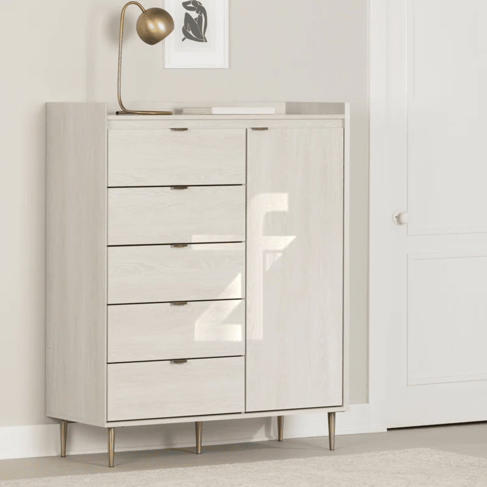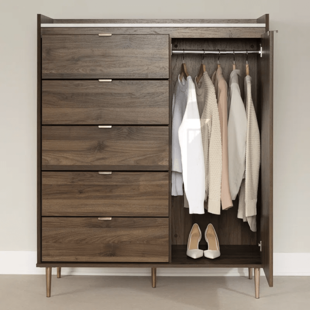 ✓ Integrated 2-in-1 Design: Combines a tall 5-drawer chest with a wider combo dresser and mirror for a complete grooming station.