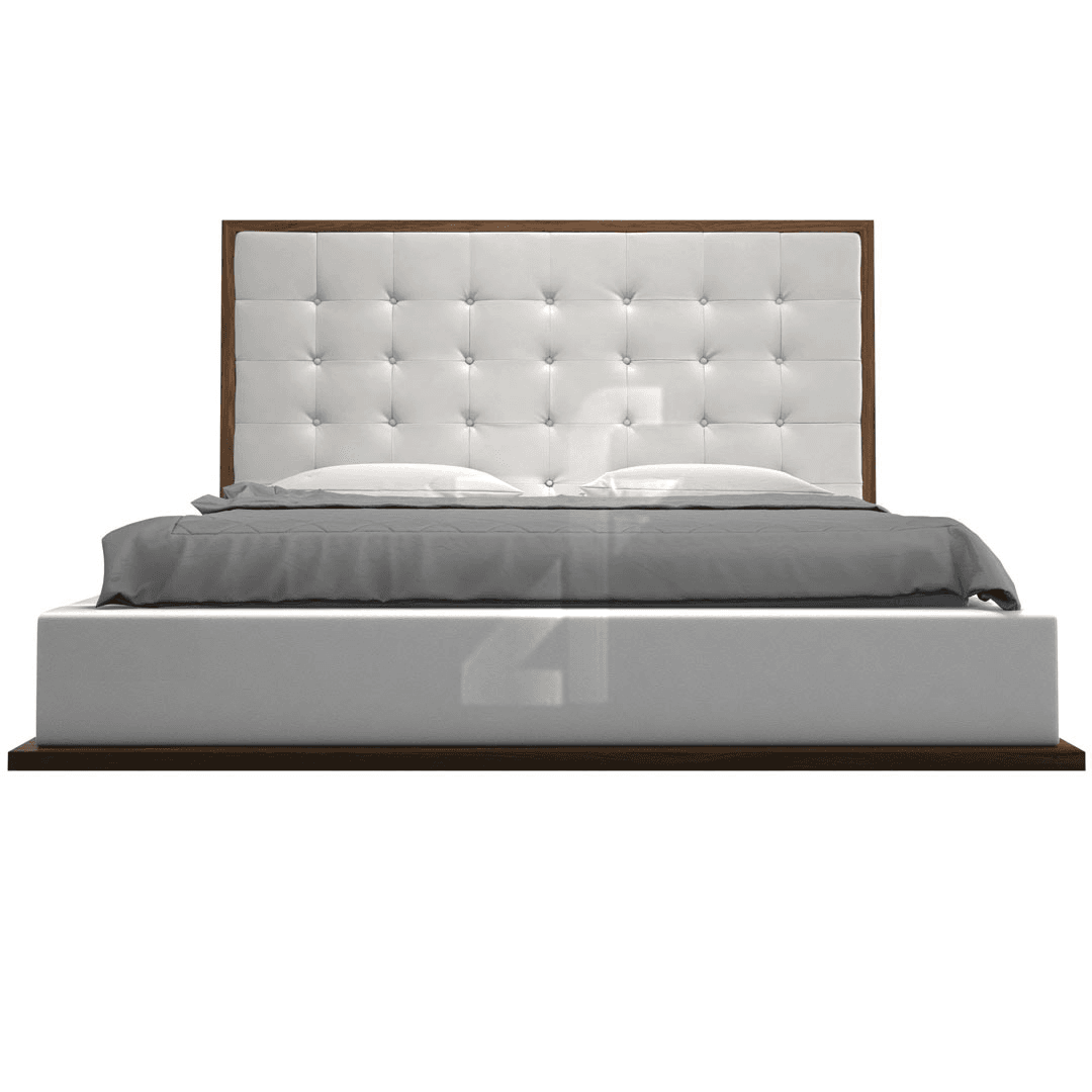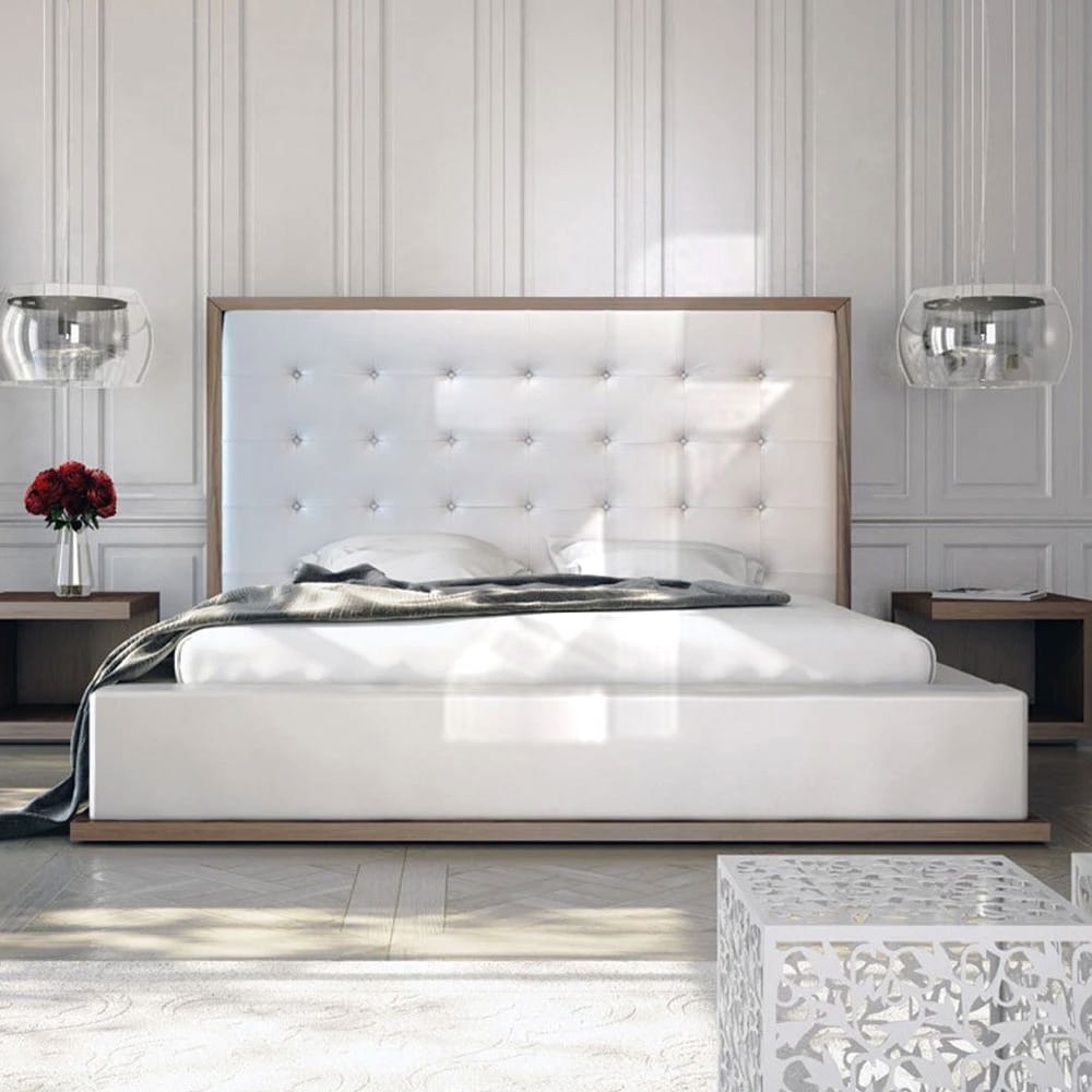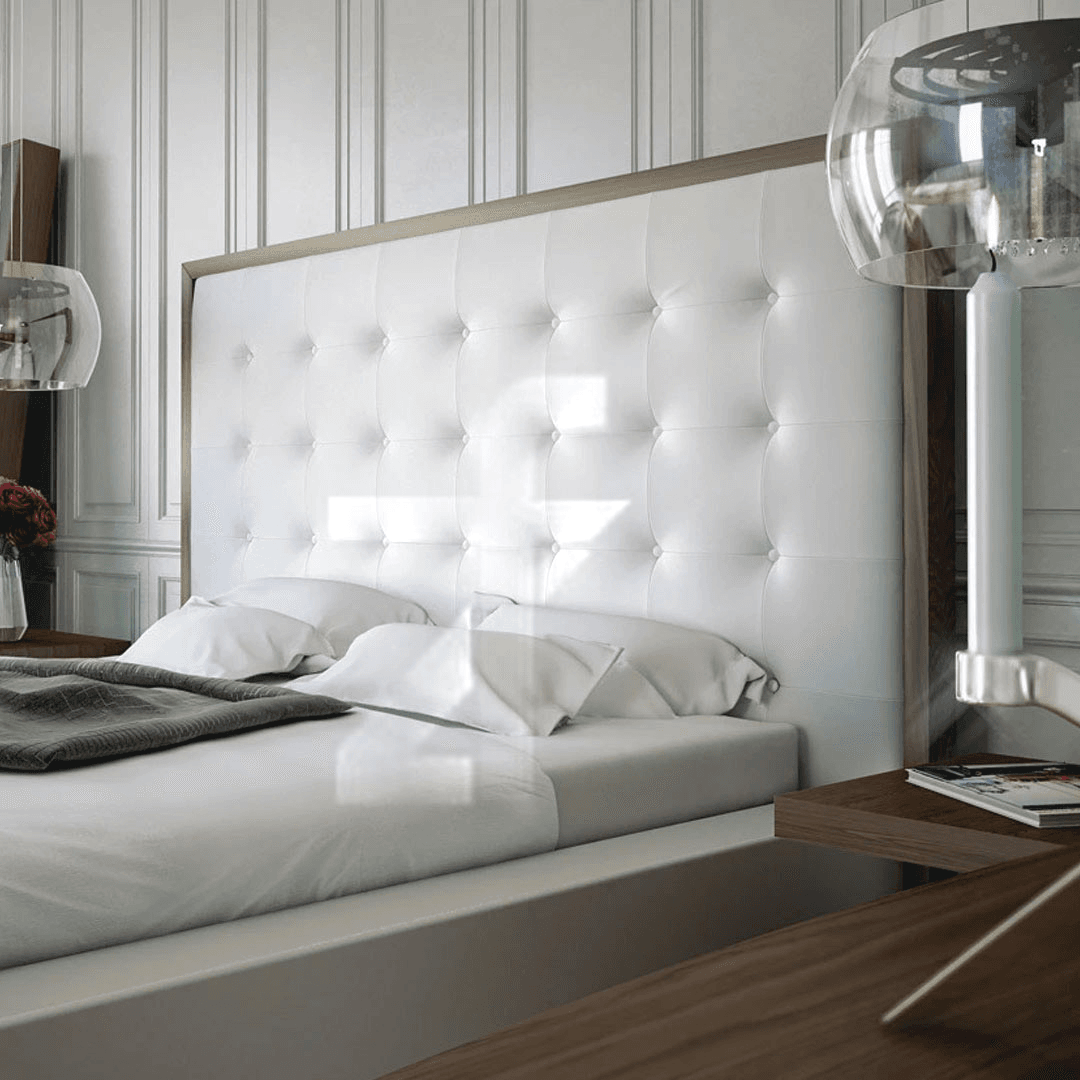 The awe inspiring Ludlow king size bed by Zohaib Furniture commands instant attention when entering a room. The lavish button tufted headboard stands five feet tall, elegantly framed in a wood border to match any decor. The smooth headboard seamlessly blends into its matching base with a wood border along the bottom edge.