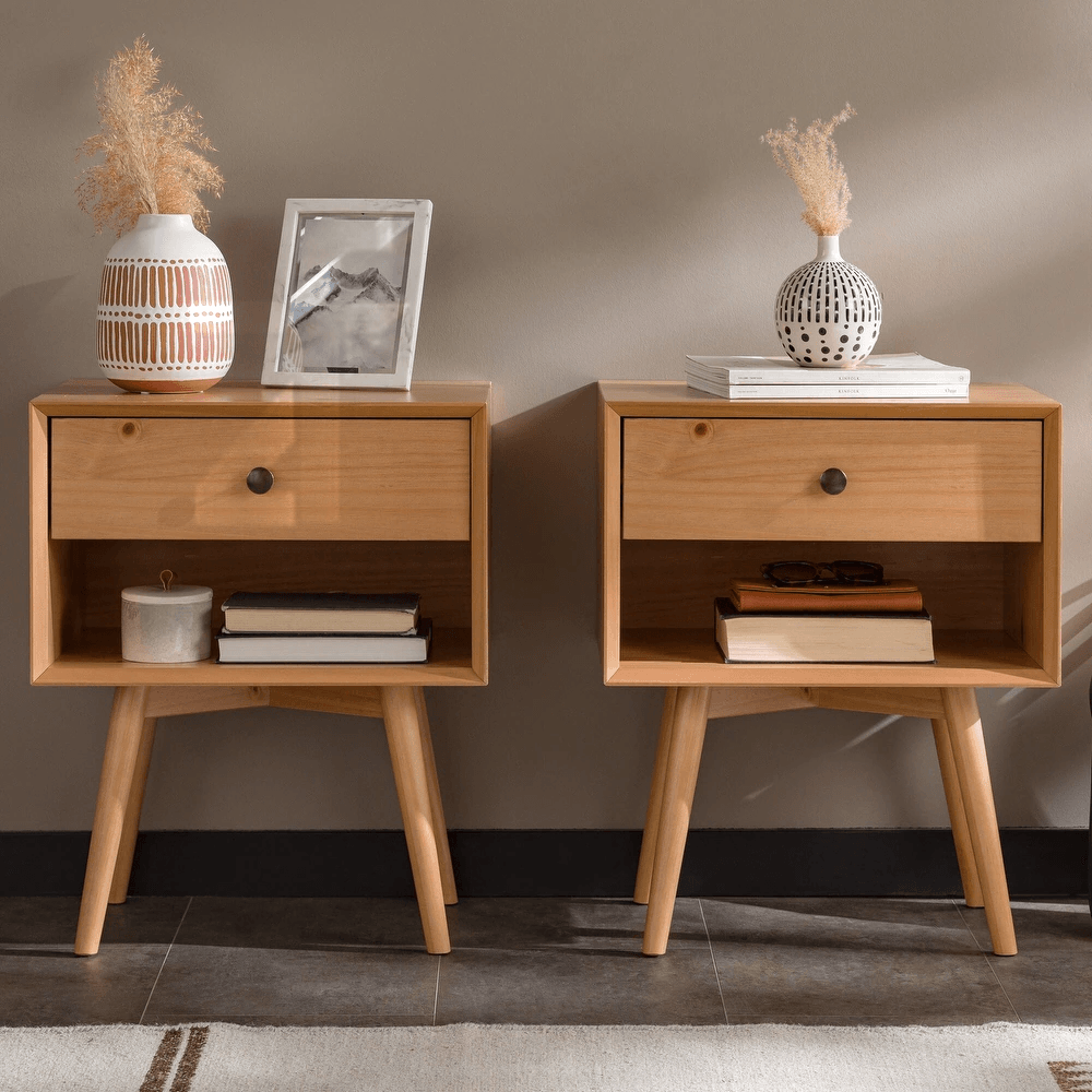This stunning Solid Wood 1 Drawer Nightstand set captures the essence of 1950s and 1960s furniture design with characteristic elements that made mid-century modern a timeless style: clean lines, organic materials, functional simplicity, and those signature angled legs that give furniture visual lightness. Crafted from solid wood complemented by MDF components, each nightstand balances authentic vintage appeal with modern construction techniques that ensure lasting durability.