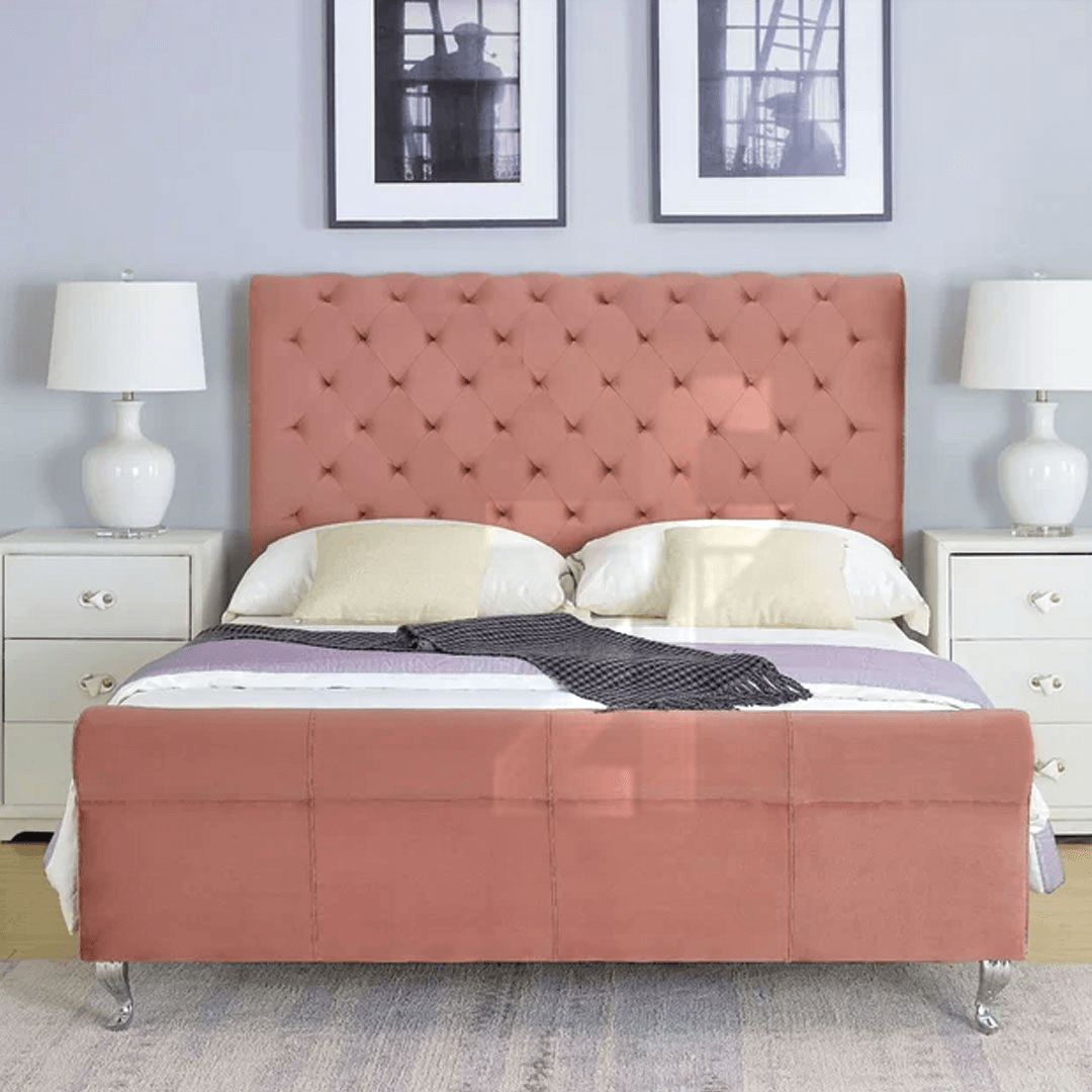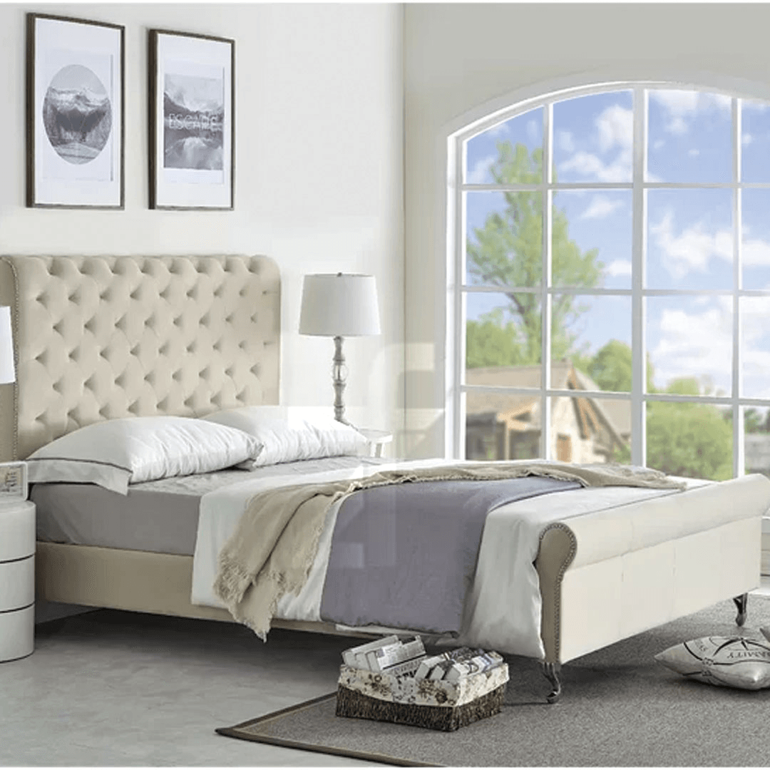 Finished with gleaming nail head trim accenting every edge, this meticulous detailing demonstrates superior craftsmanship while adding metallic sparkle that catches light beautifully throughout the day. Available in luxurious velvet upholstery offering soft, touchable surface with rich color saturation, also customizable in premium faux leather for easy maintenance elegance or sophisticated linen fabric for textured natural beauty. Constructed from solid wood frame with foam padding and quality fabric ensuring structural integrity supporting the bed’s substantial presence and luxurious materials, this statement bed creates ASMR like sleep experience drifting you off to dreamland in unparalleled style and comfort. Fully customizable in any size or color to match your exact vision, the Villeda Sleigh Bed represents bold design choice for UAE residents who refuse to compromise on luxury, quality, or visual impact creating bedrooms worthy of five-star resorts.