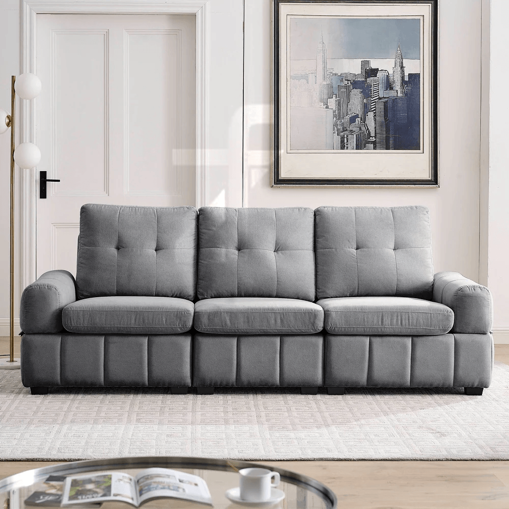 Introducing our Modern Tufted Sofa with storage space, the perfect blend of style and function. This comfortable and elegant three-section sofa features a simple and sleek design that will complement any decor theme. Lounge sofa, modern tufted sleeper three-seater fabric sofa that is perfect for your living room, bedroom or office.