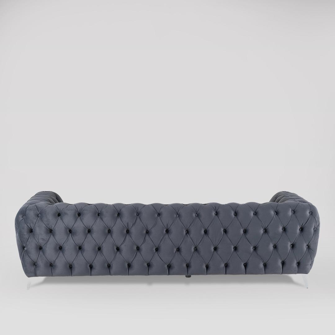 The London 3 Seater’s defining characteristic is its exquisite velvet upholstery—a fabric long associated with luxury, comfort, and refined taste. The rich dark grey coloration provides versatile neutrality that complements virtually any color scheme while adding depth and sophistication that lighter neutrals cannot match. Velvet’s unique pile structure creates a dynamic, light-reflective surface that appears to change tone and depth depending on viewing angle and lighting conditions, adding visual interest that keeps the piece perpetually engaging.