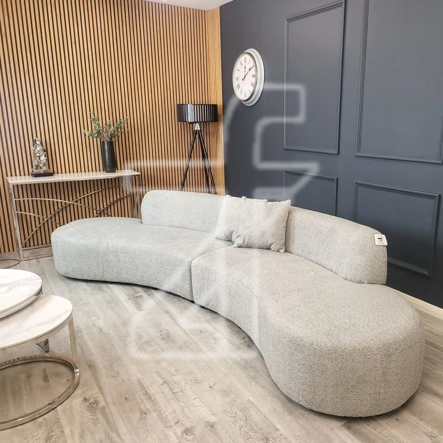 The Zen Curve Sofa brings a fresh, contemporary aesthetic to modern living spaces with its unique, flowing curved shape and plush comfort designed for versatile styling and built to last, this distinctive sofa redefines the art of lounging. Featuring an organic, flowing shape upholstered in plush, textured fabric in soft grey tone, the Zen Curve creates a natural focal point that transforms any living room into a haven of relaxation and sophisticated style. With high density foam cushions providing supportive yet plush seating and a robust hardwood frame guaranteeing exceptional stability, this striking curved sofa offers the perfect balance of modern elegance and unparalleled comfort for those who appreciate distinctive design and quality craftsmanship.